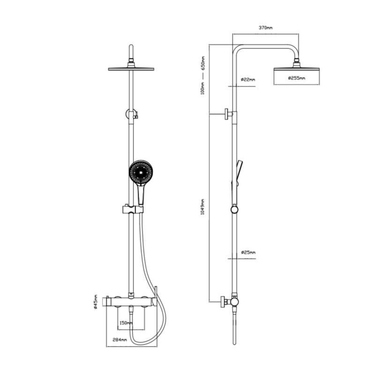 Змішувач, кронштейн для верхнього душу, лійка для верхнього душу, кронштейн для ручного душу, лійка для ручного душу, душовий шланг, душова стійка, кріпильні деталі. |