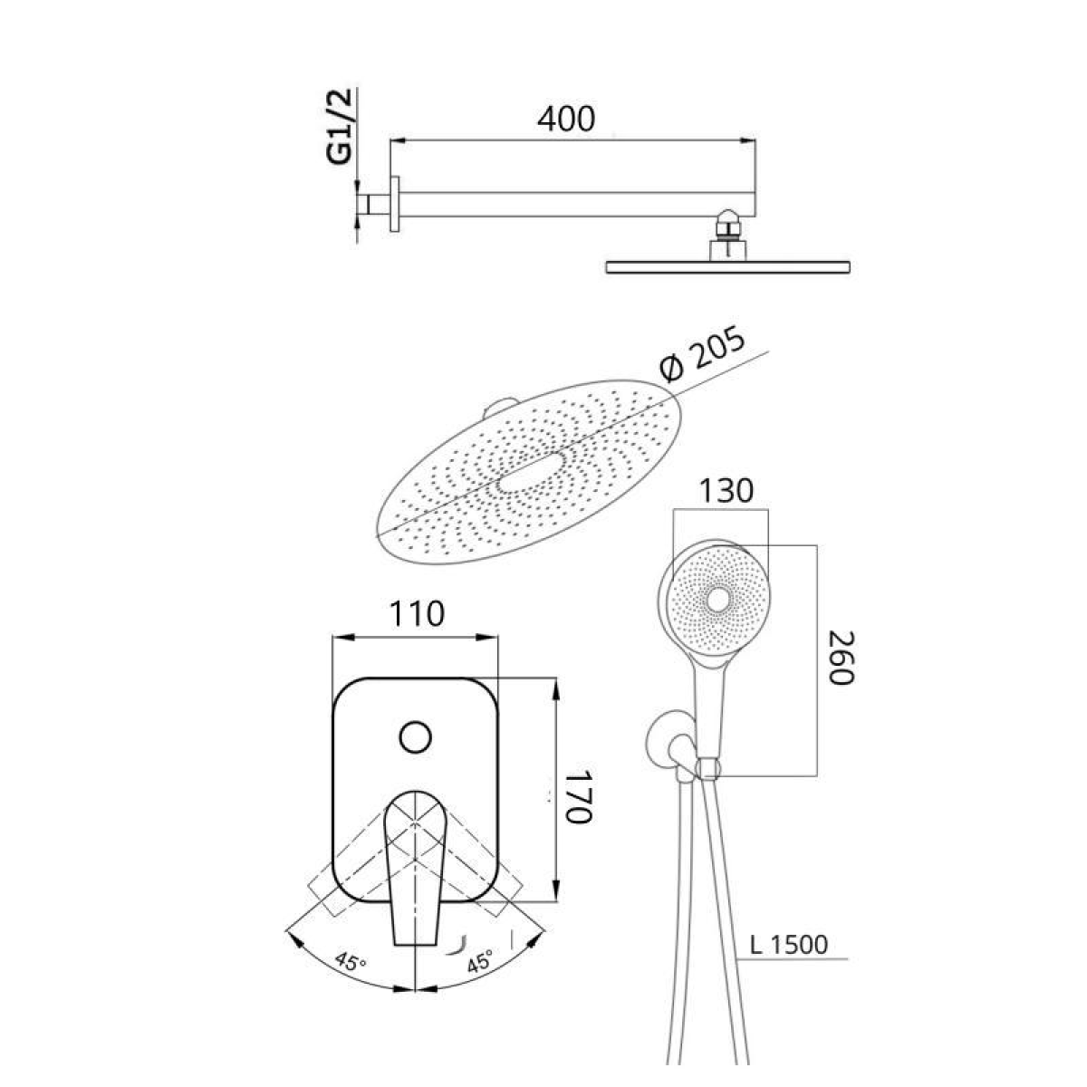 Габаритні розміри виробу (ШхГхВ), мм Лійка верхнього душу: 205х205х50; ручна лійка: 130х50х260; змішувач: 110х30х170