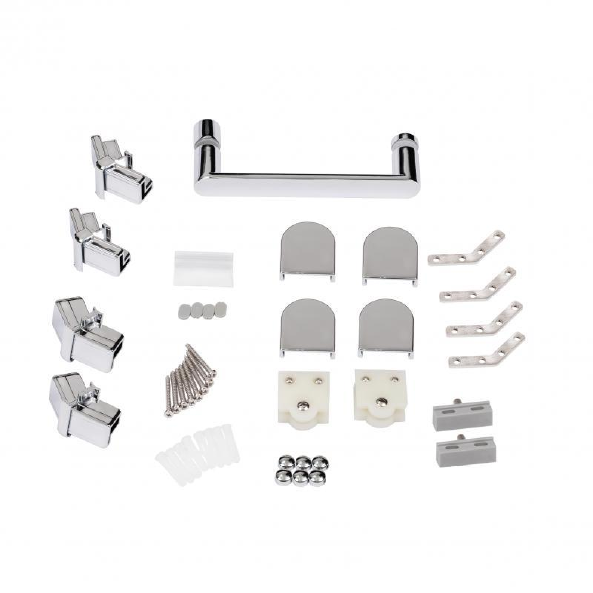 Комплектация Верхній профіль, нижній профіль, бічні профілі, розширювальні профілі, петлі, тримачі скла, комплект кріпильних деталей, заглушки, ручка, набір ущільнювачів, глухе скло, скляні двері.