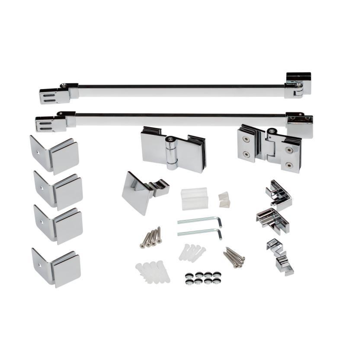 Комплектация Петлі, кронштейн, бічна панель, скляні двері, ручка, нижній борт, комплект кріплень, набір ущільнювачів, бічні профілі, розширювальні профілі, заглушки, піддон, ніжки, сифон із гідрозатвором.