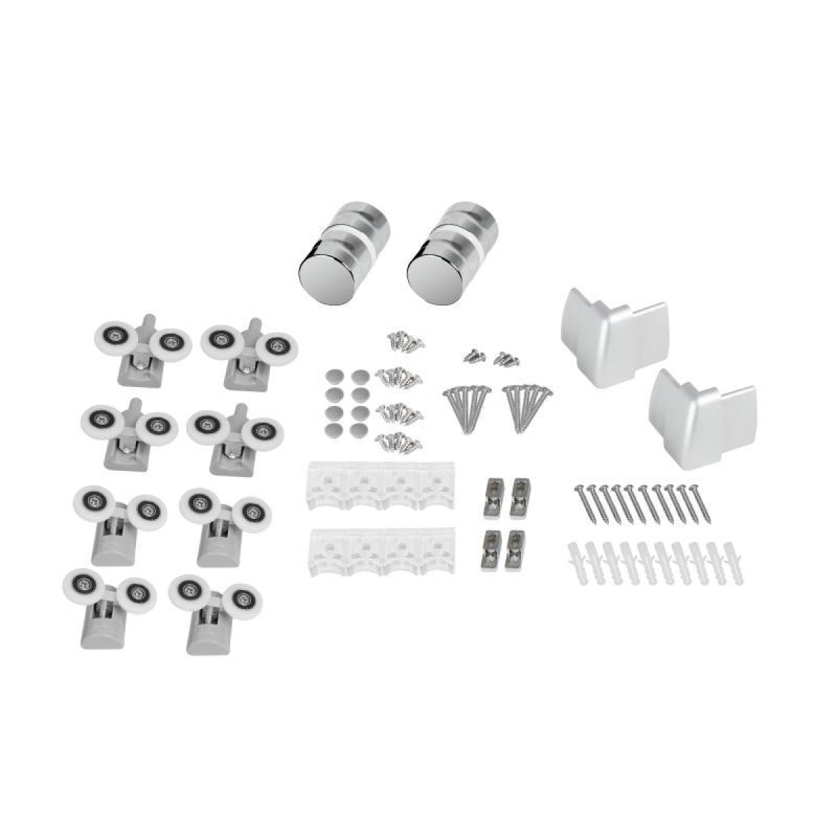 Комплектация Подвійні ролики, ручки, комплект кріпильних деталей, глухе скло, скляні двері, профіль.