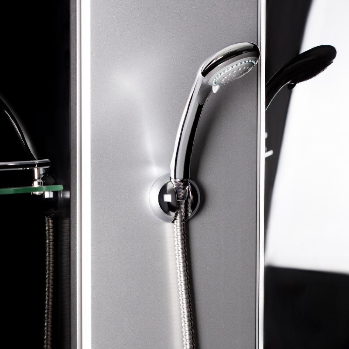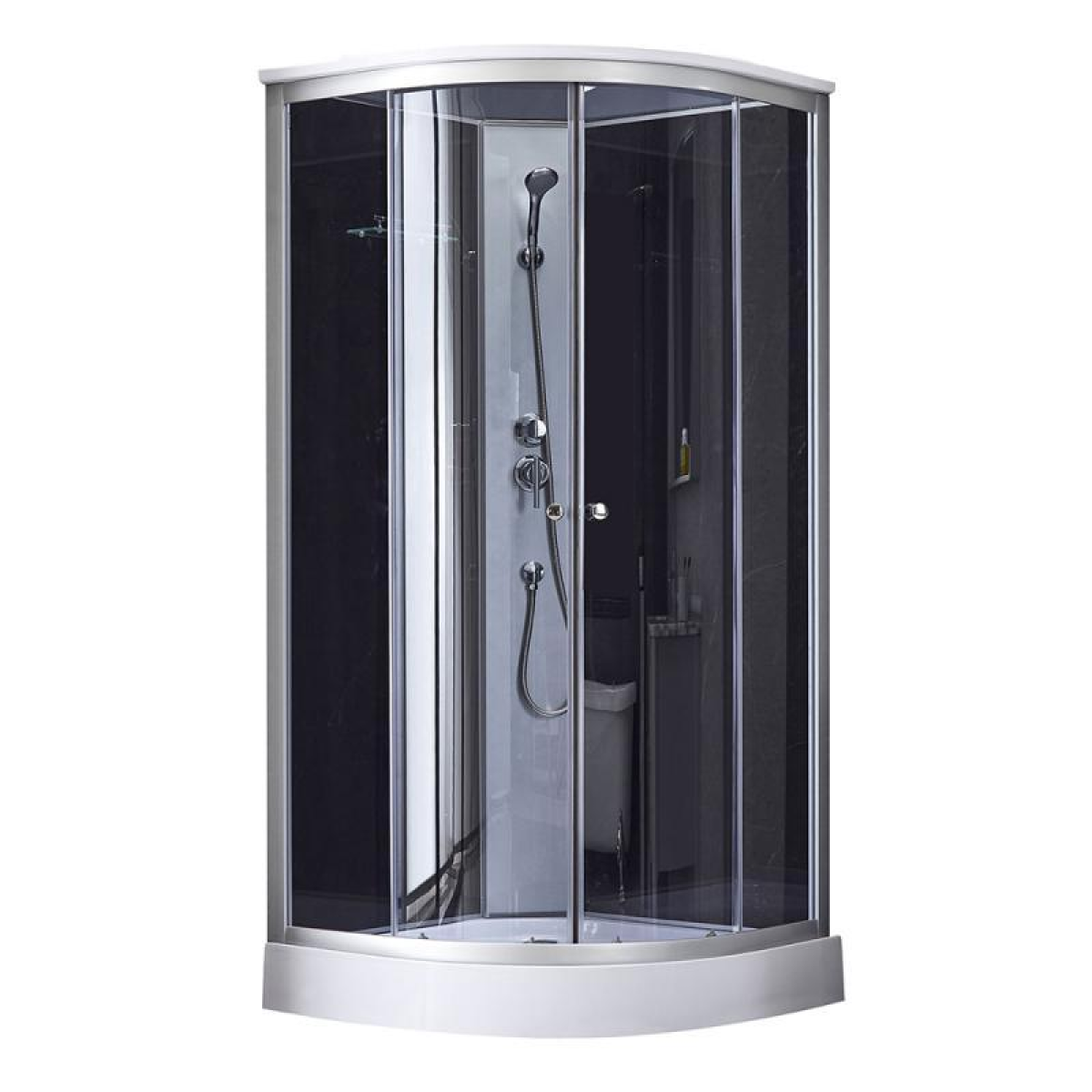 Комплектация Піддон, сифон, двері, ручки, ролики, профіль, комплект кріпильних деталей, задня стінка, панель, змішувач, лійка для ручного душа, лійка для верхнього душа, душової шланг, кронштейн, ніжки, верхня кришка, скляна полиця.