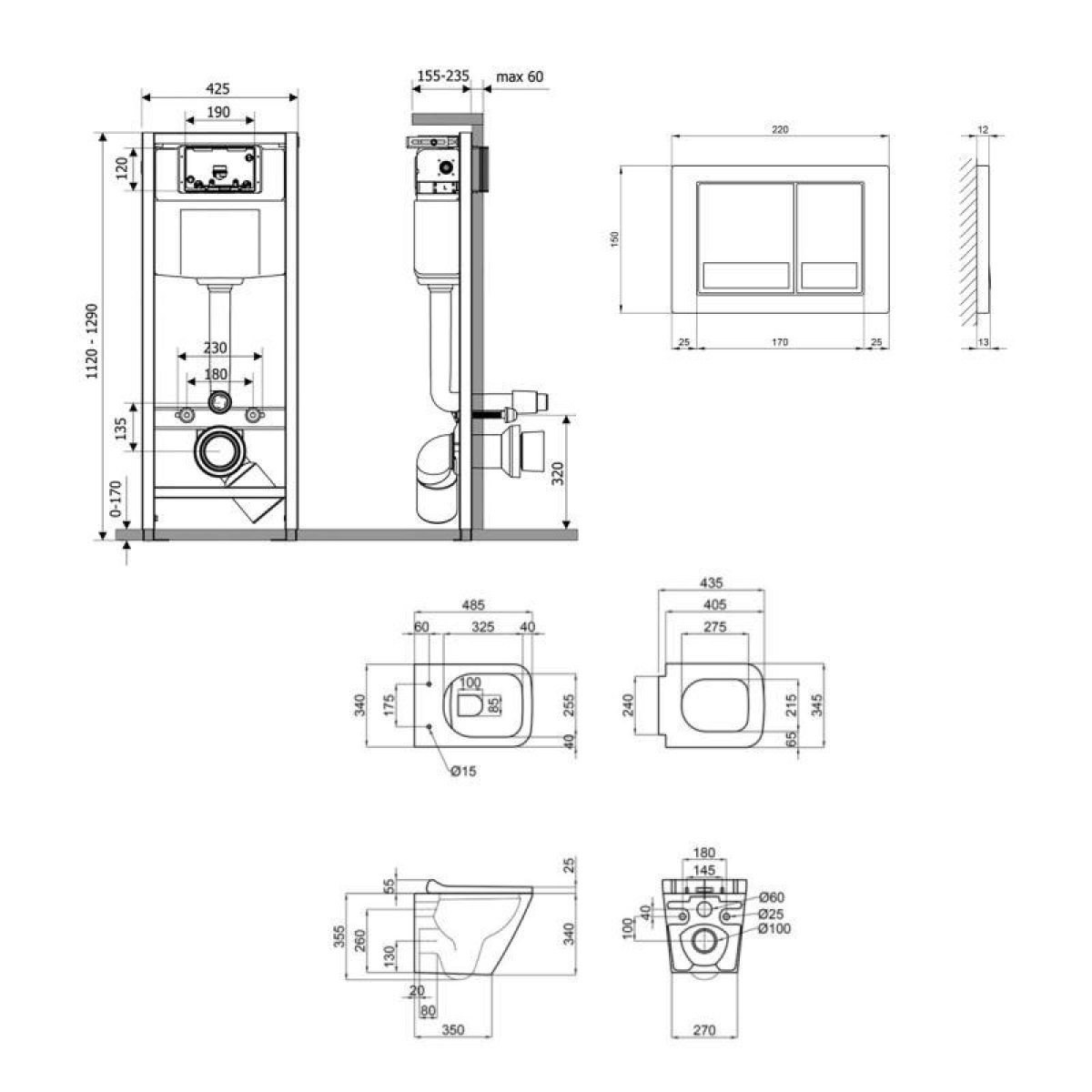 Габаритні розміри виробу (ШхГхВ), мм Інсталяція: 1280х425х185. Панель змиву: 150х220х13. Унітаз: 355х340х485. Сидіння для унітазу: 55х345х435.