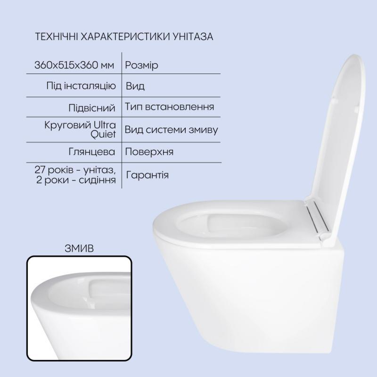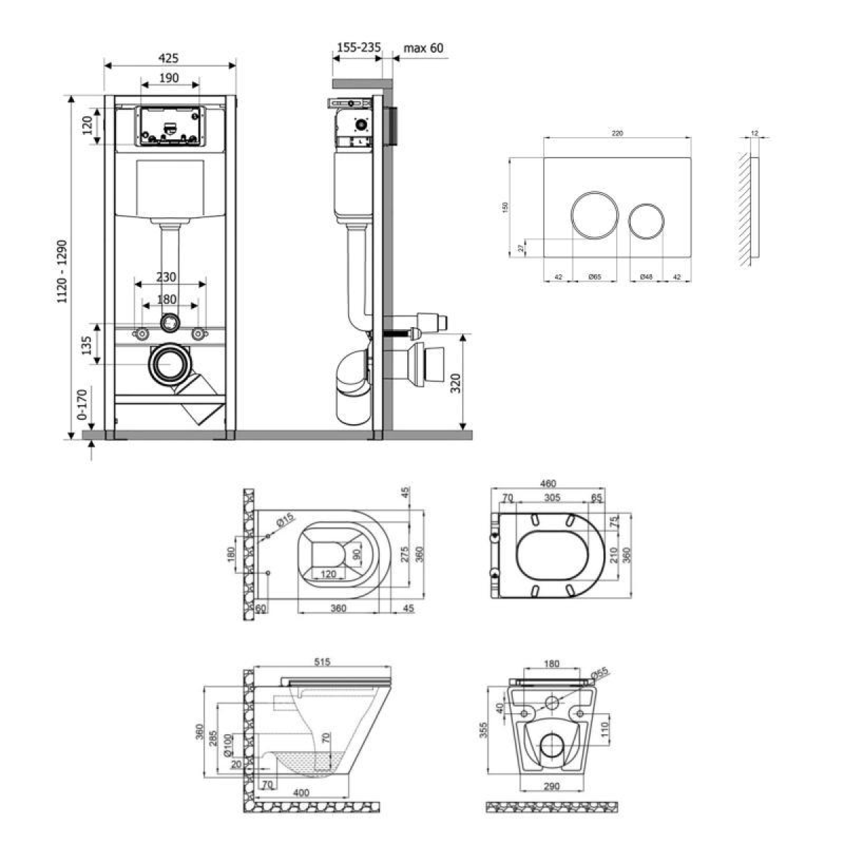 Унітаз: 355х340х485. Сидіння для унітазу: 55х345х435. Інсталяція: 1280х425х185. Панель змиву: 150х220х30. |