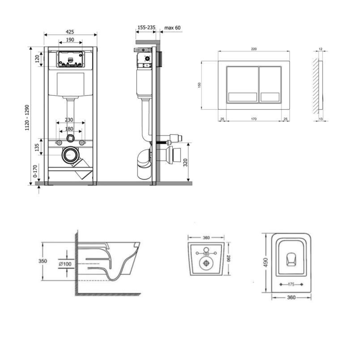 Унітаз: 350х360х520. Сидіння для унітазу: 50х350х445. Інсталяція: 1280х425х185. Панель змиву: 150х220х30. |