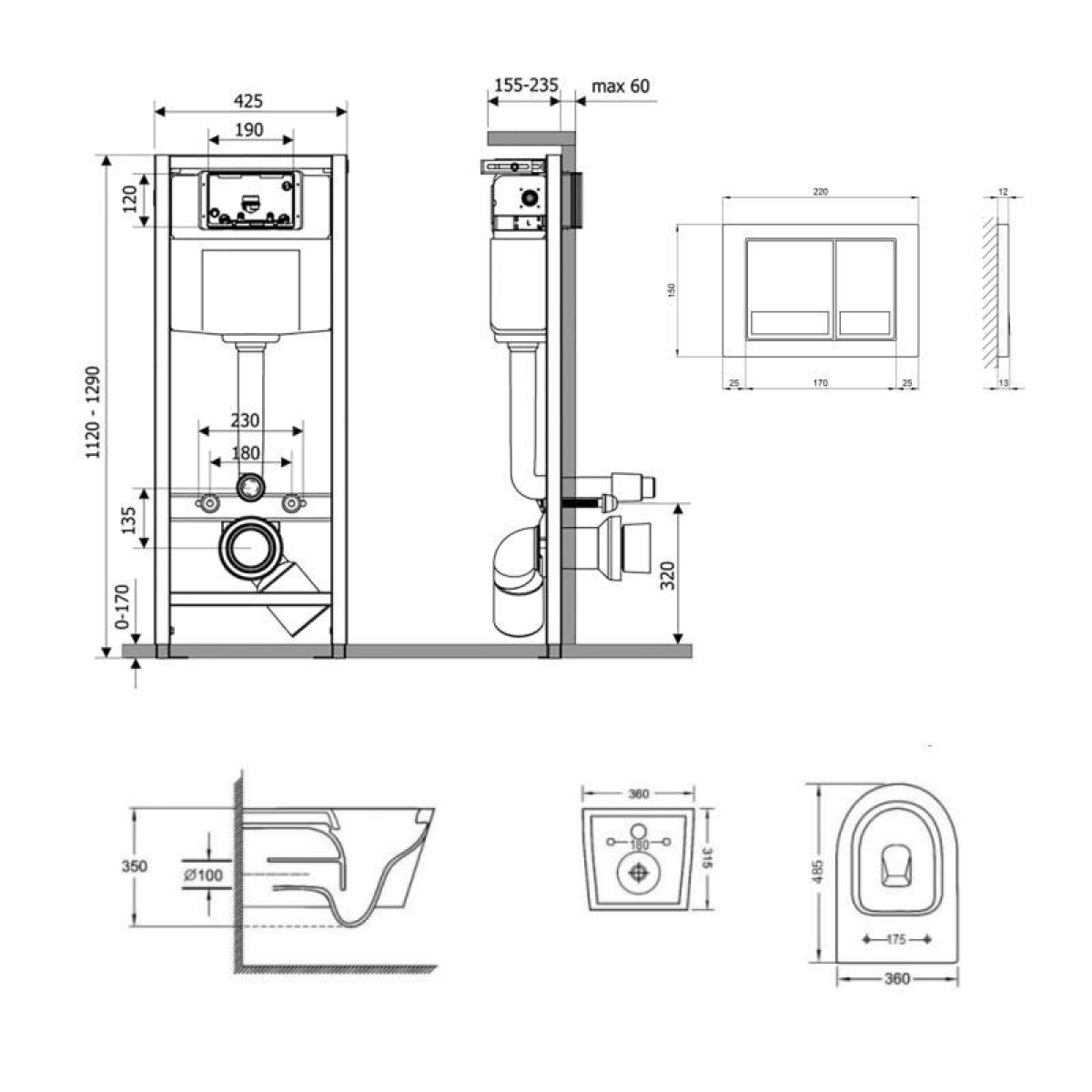 Унітаз: 350х360х520. Сидіння для унітазу: 35х367х455. Інсталяція: 1280х425х185. Панель змиву: 150х220х30. |