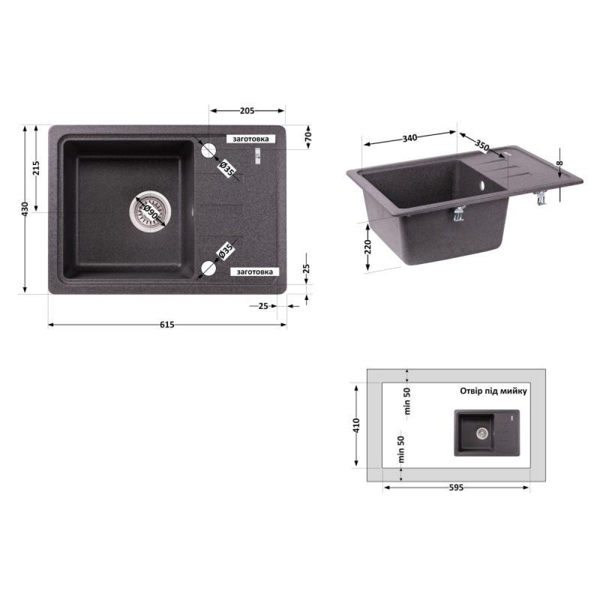 Комплектация Мийка, сифон, слив/перелив, кошиковий вентиль, кріплення.