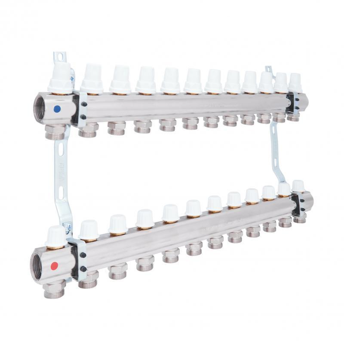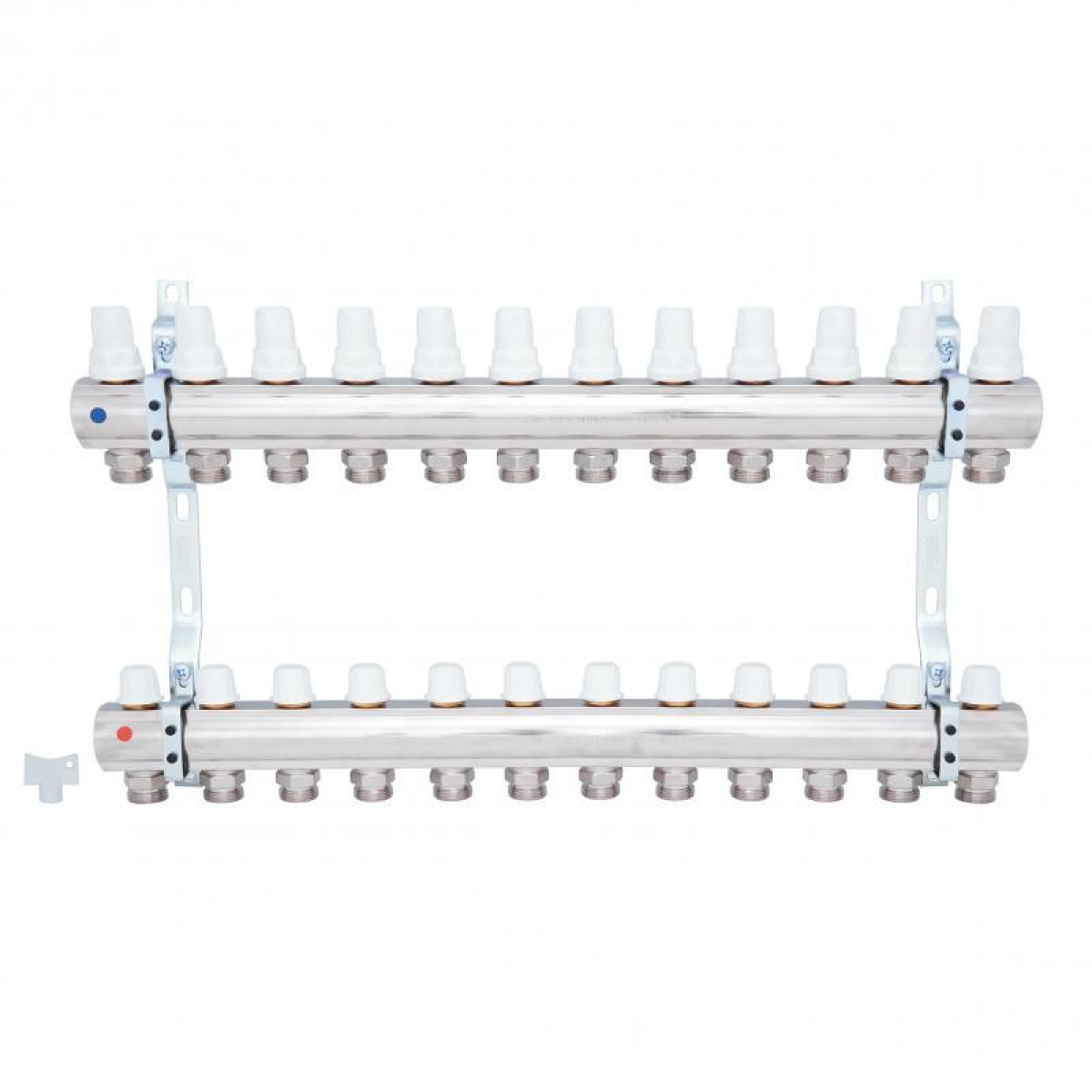 Колектор ICMA Арт. K005 з запірними кранами з мікрометричним регулюванням призначений для розподілу теплової енергії в системі опалення. Дана установка застосовується в системах радіаторного опалення. Регулювання витрати мережної води по контурах - ручна або терморегулююча. Запірні крани з мікрометричним регулюванням дозволяють перекривати подачу води і регулювати витрату мережної води в кожному контурі опалення. Колектор має 12 виходів.