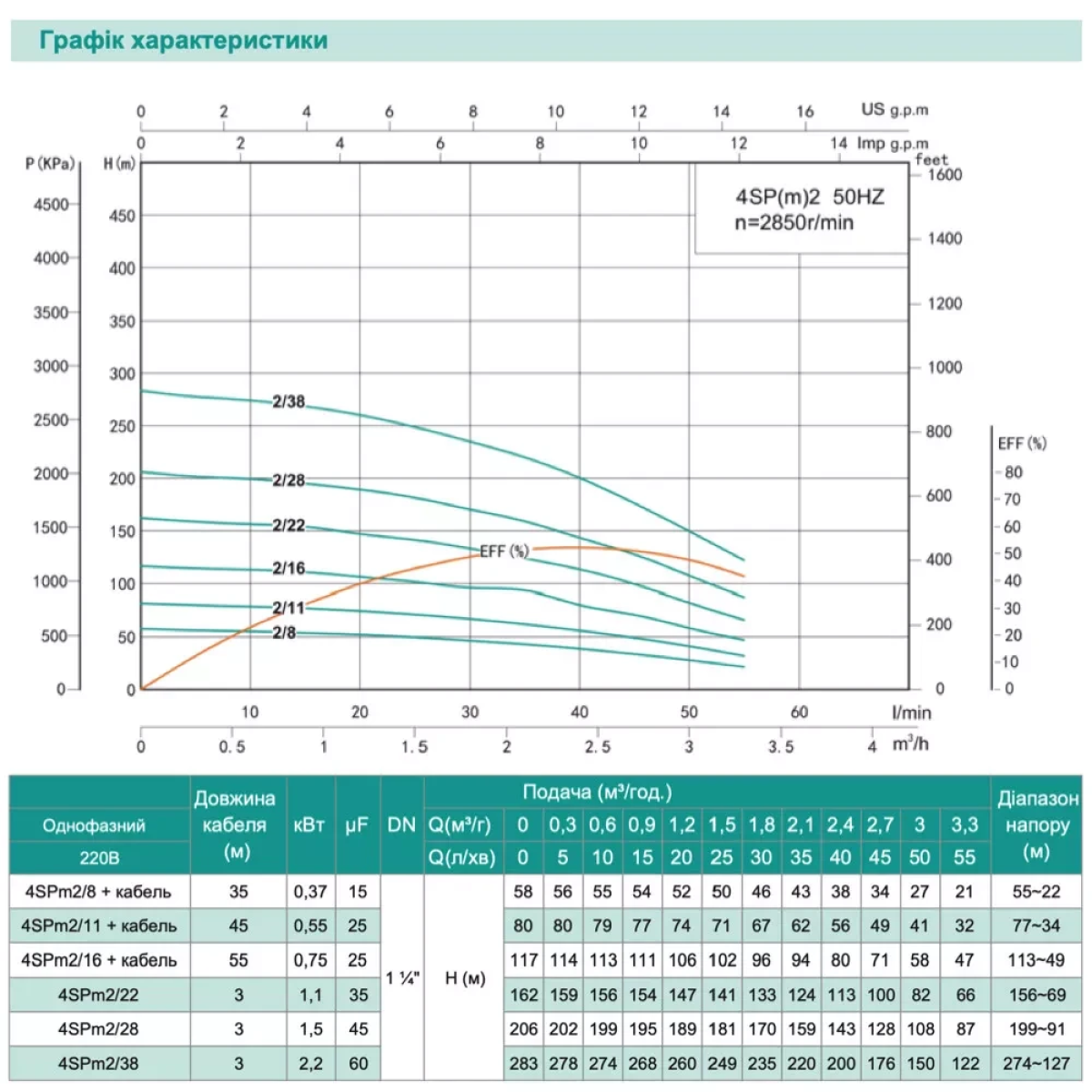 Насос свердловинний SHIMGE 4SP(m) 2/22-1.1 кВт, Н 162(124)м, Q 55(30)л/хв, Ø96 мм, (кабель 3 м)