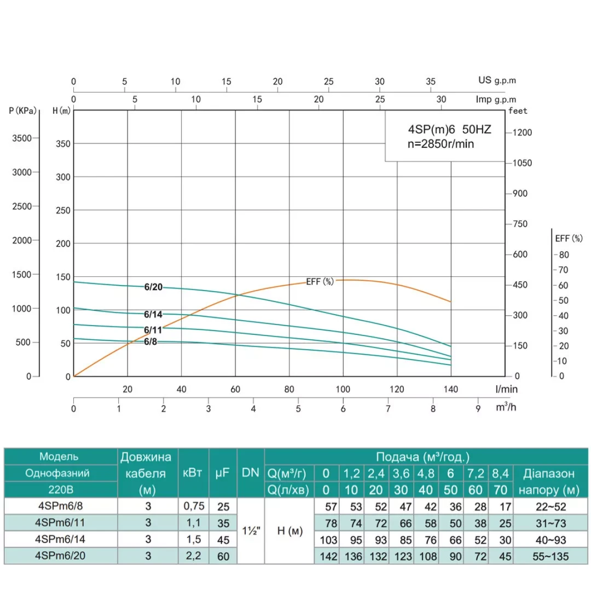 Насос свердловинний SHIMGE 4SP(m) 6/20-2.2 кВт, Н142(90)м, Q140(100) л/хв, Ø96 мм