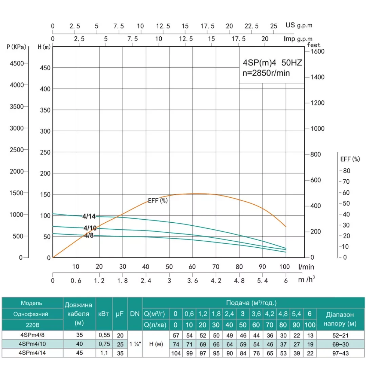 Насос свердловинний SHIMGE 4SP(m) 4/10-0.75 кВт, Н74(54)м, Q100(60) л/хв, Ø96 мм, (кабель 40 м)