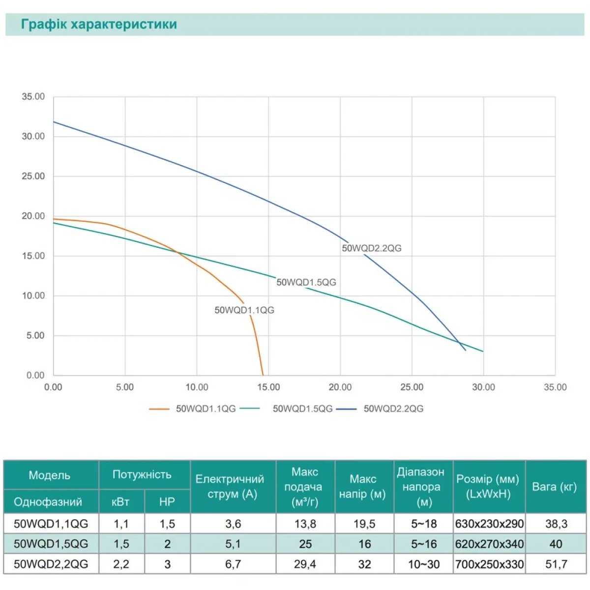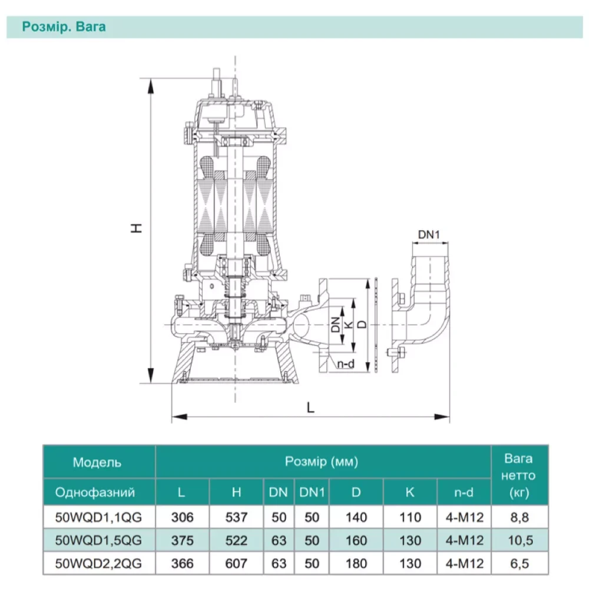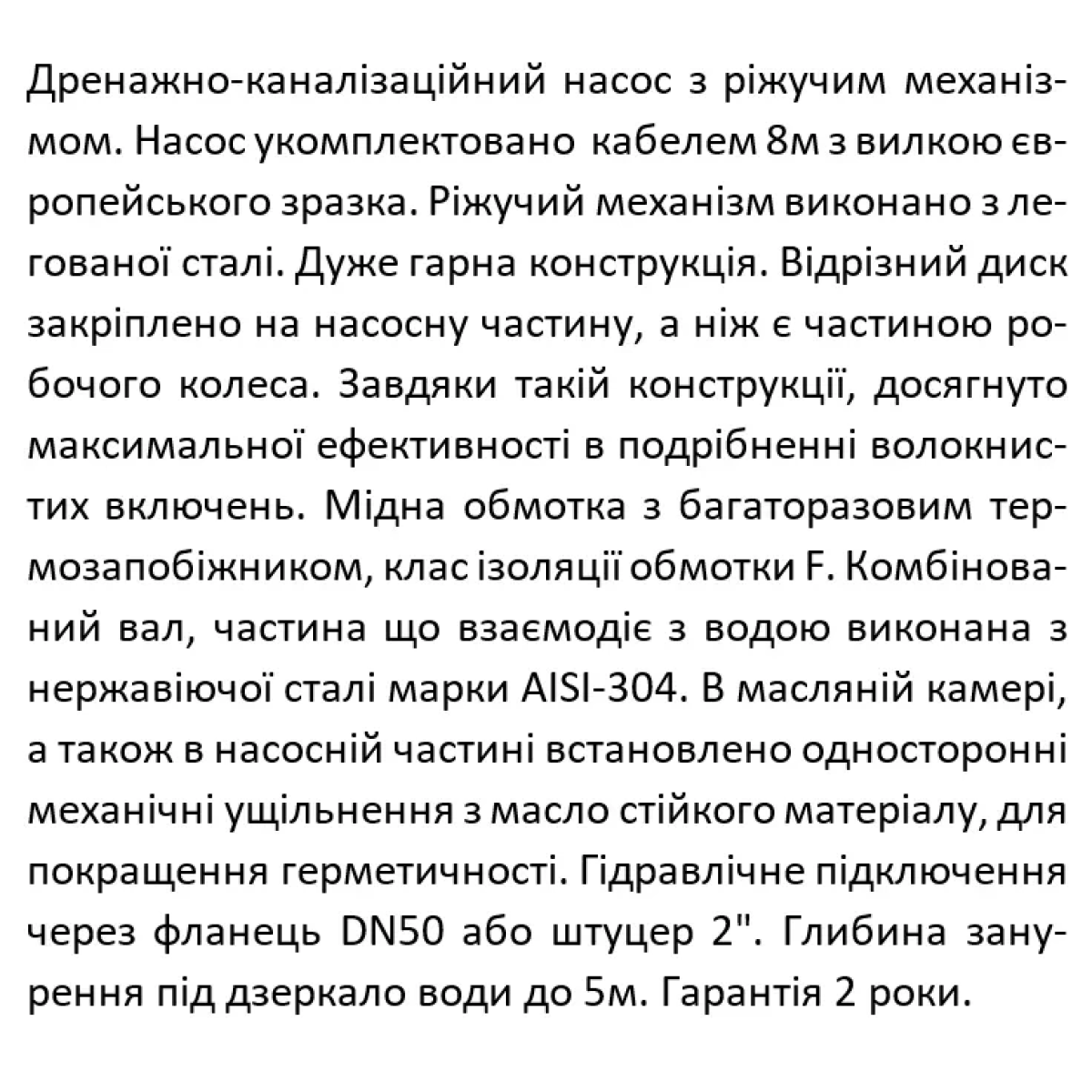 Дренажно-фекальний насос SHIMGE 50WQD2.2QG з ножем, Нmax=32 м, Qmax=490 л/хв.