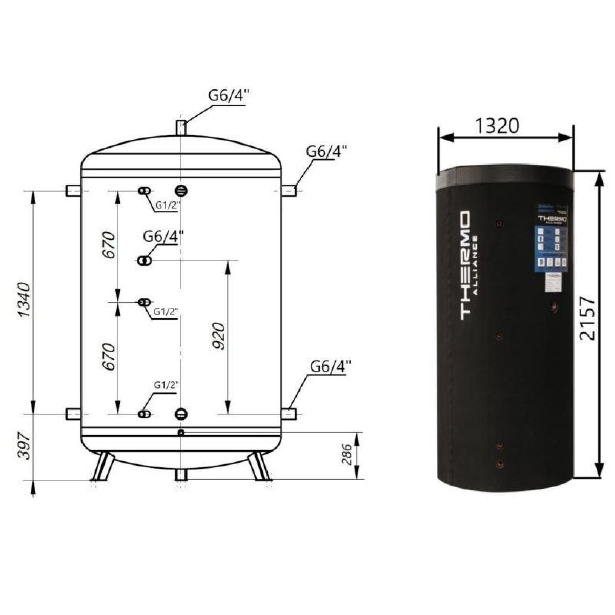 Теплоакумулятор Thermo Alliance TA-ТАМ-00 2000 (60 мм) — резервуар для підлоги великого об“єму для акумуляції, зберігання, передачі рідкого теплоносія різного походження. Наприклад, такими джерелами непостійної дії можуть бути сонячні колектори, котли на твердому паливі, теплові насоси та інші. Буферний бак забезпечить безпечну роботу опалювальної системи та економію енергоресурсів. Виріб має тришарову жорстку теплоізоляцію. Виходять патрубки з внутрішнім різьбленням.
