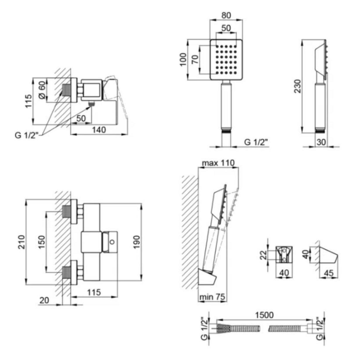 Додаткові характеристики Харчова нержавіюча сталь AISI 304. Лійка (ВхШ) 230х80 мм. Кількість форсунок 30 шт. Довжина душового шланга - 1500 мм.